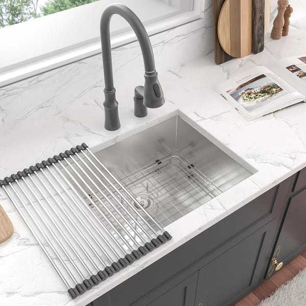 23 in. Undermount Single Bowl 18-Gauge Brushed Nickel Stainless Steel Zero Radius Corner Kitchen Sink with Bottom Grid