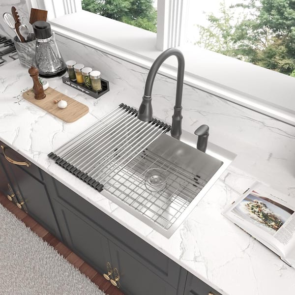 25 in. Drop-In/Topmount Single Bowl 16 Gauge Stainless Steel Round Corner Kitchen Sink with Bottom Grid