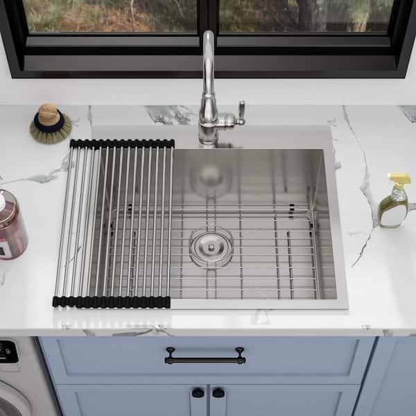 25 in. Single Bowl Zero Radius Corner 18 -Gauge Stainless Steel Drop-in/Topmount Kitchen Sink Bar Sink with Bottom Grid