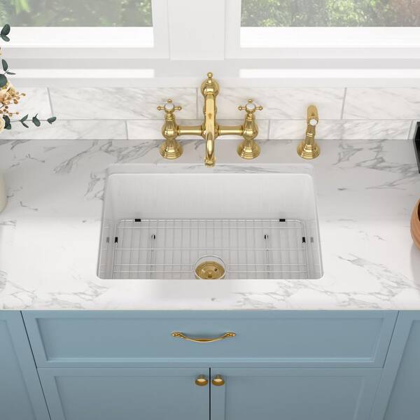 27 in. Undermount Single Bowl White Porcelain Ceramic Kitchen Sink with Bottom Grid and Strainer in Gold