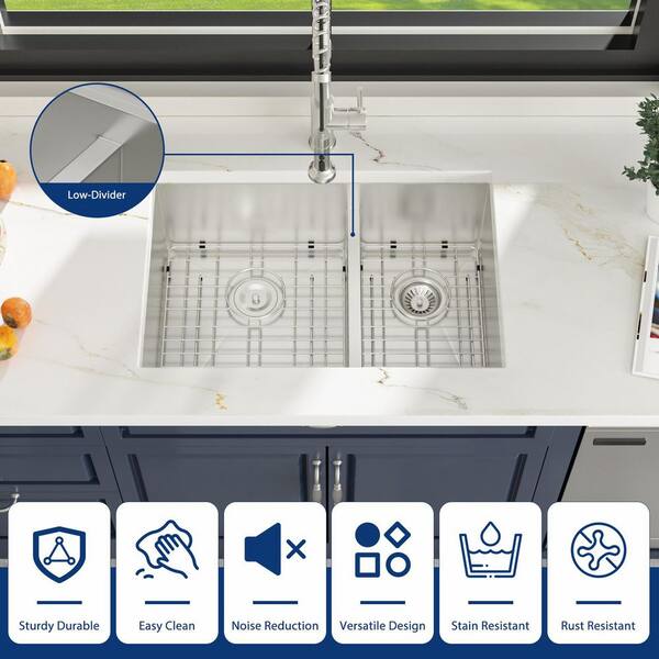 28 in. Low-Divide Undermount Double Bowl 16 -Gauge Stainless Steel Kitchen Sink 60/40 Under Counter Kitchen Basin