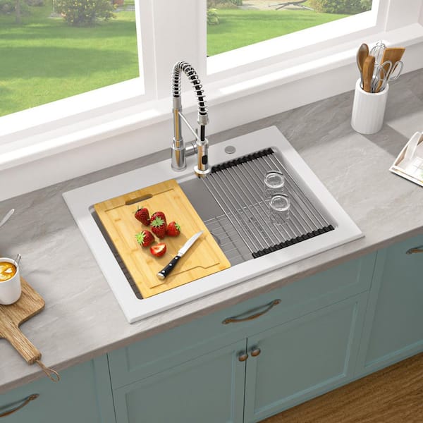 30 in. Drop-In Single Bowl White Quartz Composite Round Corner Kitchen Sink with Bottom Grid