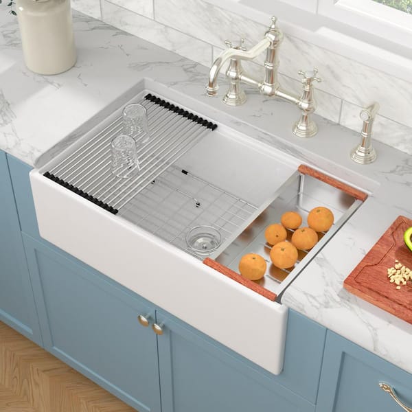 30 in. Farmhouse/Apron Front Single Bowl Round Corner White Ceramic Workstation Kitchen Sink with Bottom Grid