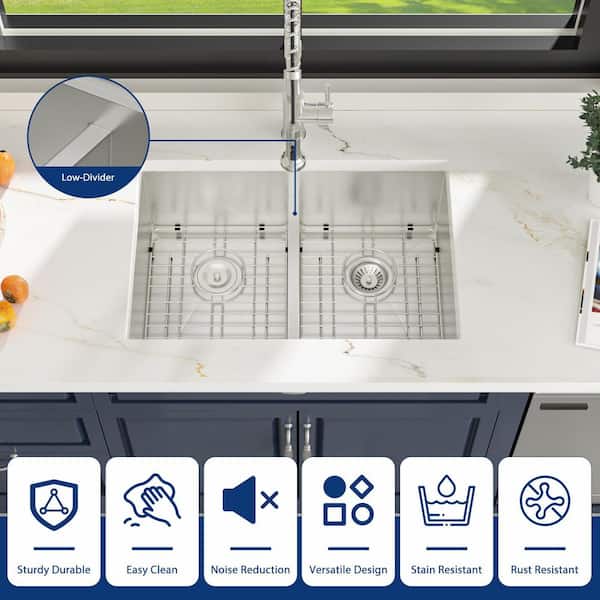 30 in. Undermount 50/50 Double Bowl 16 Gauge Stainless Steel Low Divider Kitchen Sink R10 Round Corner with Bottom Grids