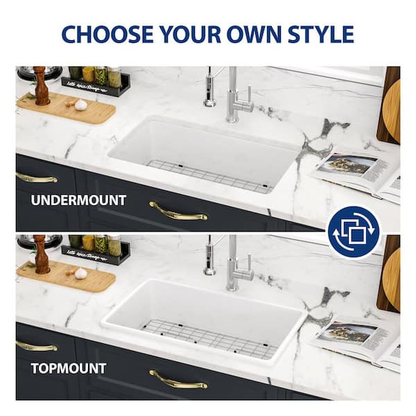 32 in. Undermount Single Bowl White Ceramic Kitchen Sink with Strainer and Bottom Grid