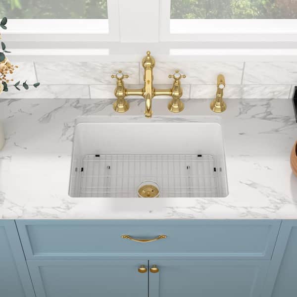 32 in. Undermount Single Bowl White Porcelain Ceramic Kitchen Sink with Bottom Grid and Gold Strainer
