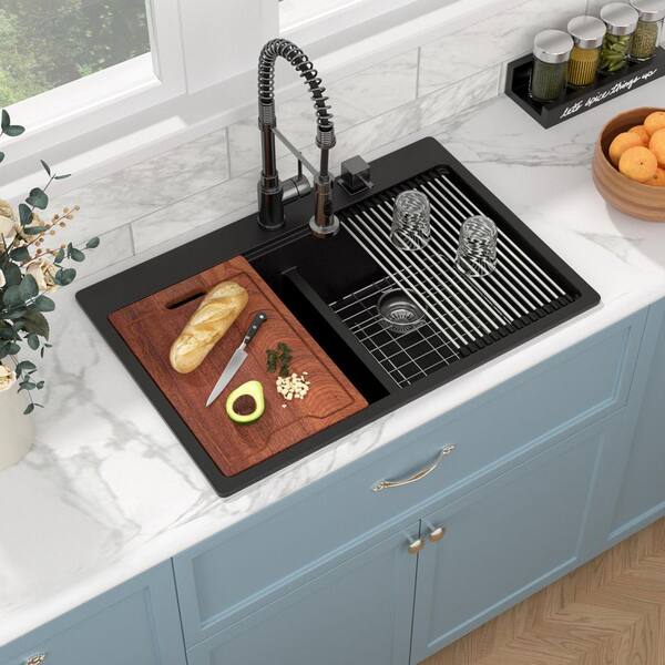 33 in. Drop-in 50/50 Double Bowl Black Quartz Composite Low Divide Ledge Workstation Kitchen Sink with Colander