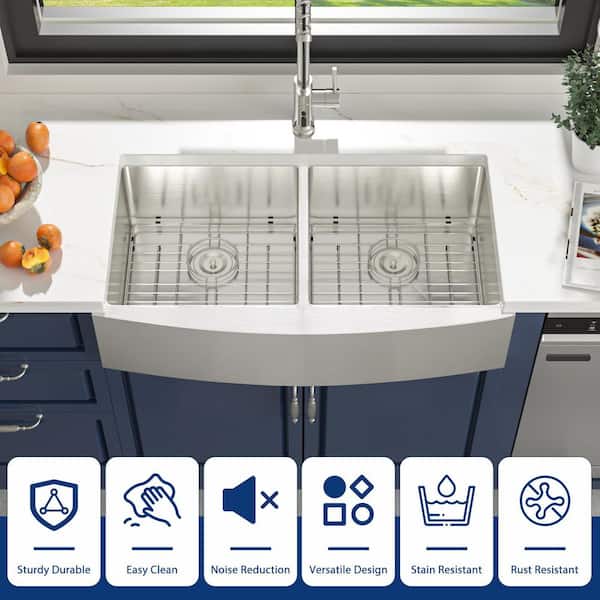 33 in. Farmhouse Apron Front 50/50 Double Bowl 18-Gauge Brushed Nickel Stainless Steel Kitchen Sink with Bottom Grids