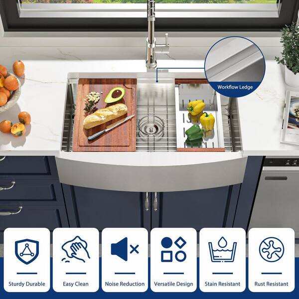 33 in. Farmhouse/Apron-Front Single Bowl 18-Gauge Stainless Steel 9 in. Deep Workstation Kitchen Sink with Cutting Board