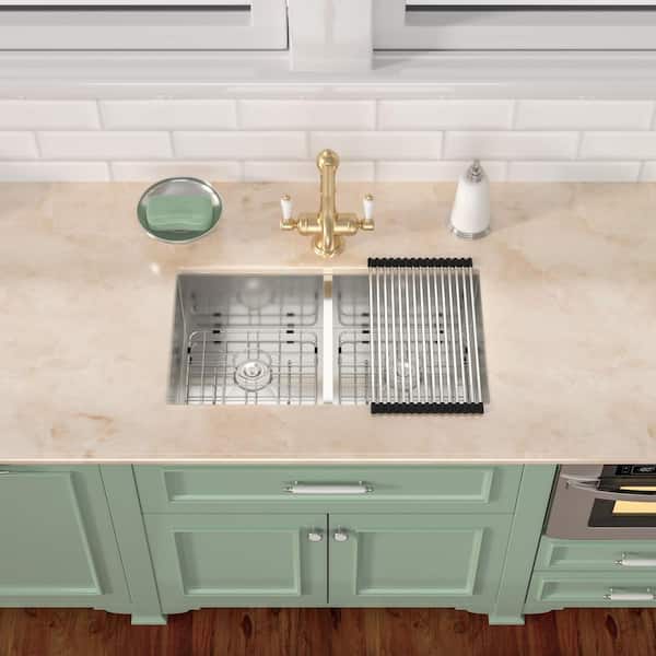33 in. Undermount 50/50 Double Bowl 18-Gauge Brushed Nickel Stainless Steel Kitchen Sink with Bottom Grid and Strainer