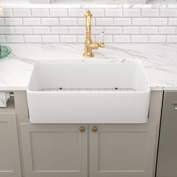 33 in. Undermount/Farmhouse Rectangle Single Bowl White Ceramic Kitchen Sink with Bottom Grid and Strainer Drain