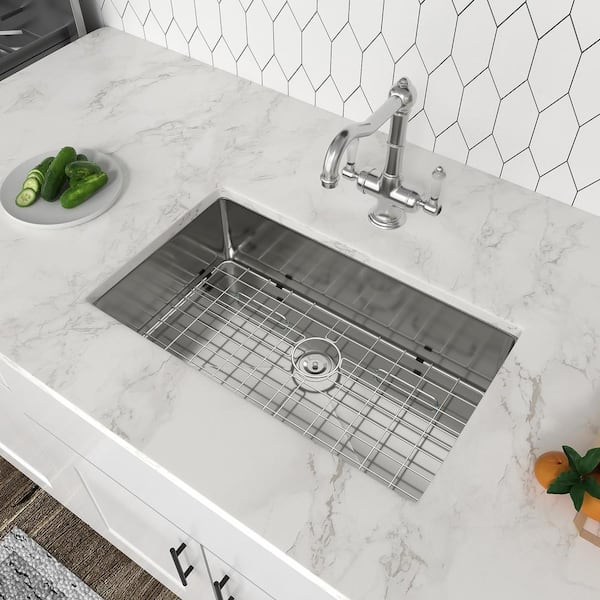 33 in. Undermount Single Bowl Round Corner 16 Gauge Stainless Steel Kitchen Sink Basin with Rolling Drying Rack