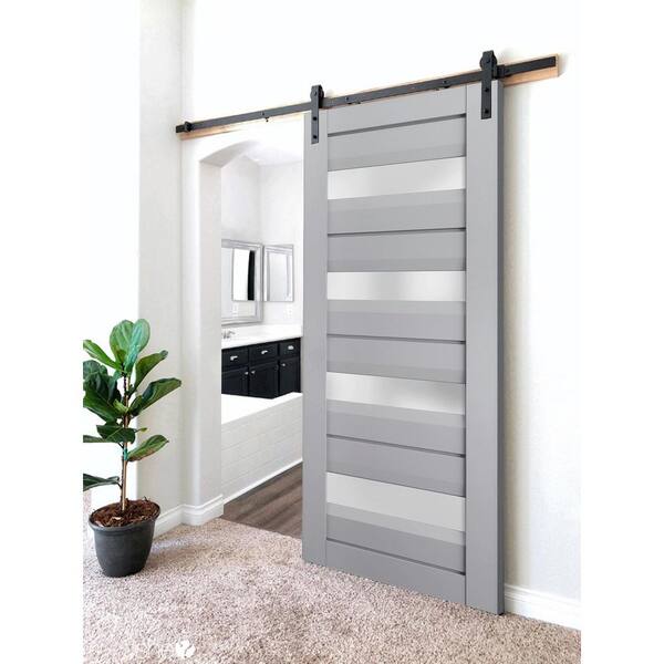 18 in. x 80 in. 1 Panel Frosted Glass Matte Grey Solid Wood Sliding Barn Door with Hardware Kit