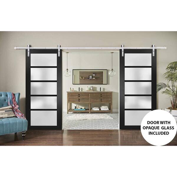 18 in. x 84 in. 2 Panel Frosted Glass Black Matte Solid MDF Sliding Barn Door with Hardware Kit