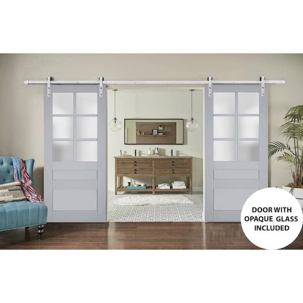 18 in. x 84 in. 2 Panel Frosted Glass Matte Grey Solid Wood Sliding Barn Door with Hardware Kit