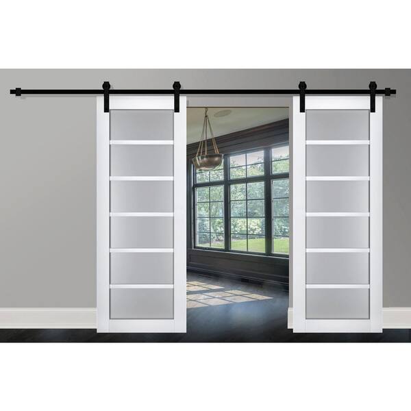 18 in. x 96 in. 2 Panel Frosted Glass White Solid Wood Sliding Barn Door with Hardware Kit