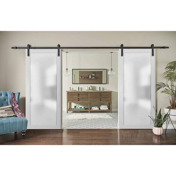 2102 48 in. x 84 in. 1-Panel 1 Lite Frosted Glass White Finished Solid Pine Wood Sliding Barn Door with Hardware Kit