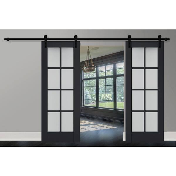 24 in. x 96 in. 2 Panel Frosted Glass Antracite Solid Wood Sliding Barn Door with Hardware Kit
