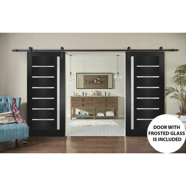 24 in. x 96 in. 2 Panel Frosted Glass Black Matte Solid MDF Sliding Barn Door with Hardware Kit