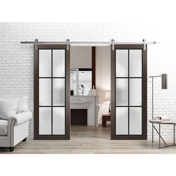 24 in. x 96 in. 2 Panel Frosted Glass Chocolate Ash Solid Wood Sliding Barn Door with Hardware Kit