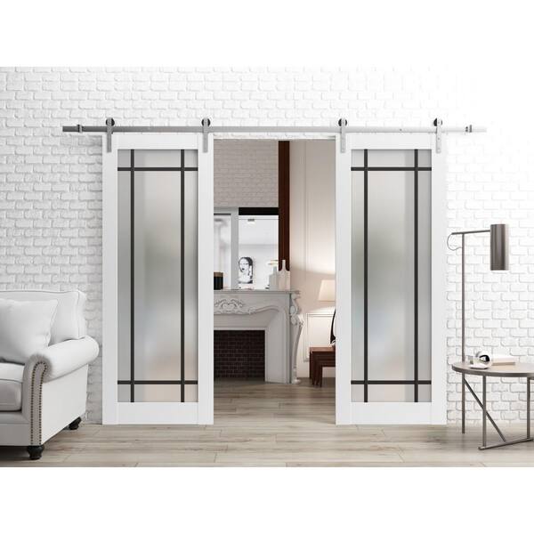 24 in. x 96 in. 2 Panel Frosted Glass White Solid Wood Sliding Barn Door with Hardware Kit
