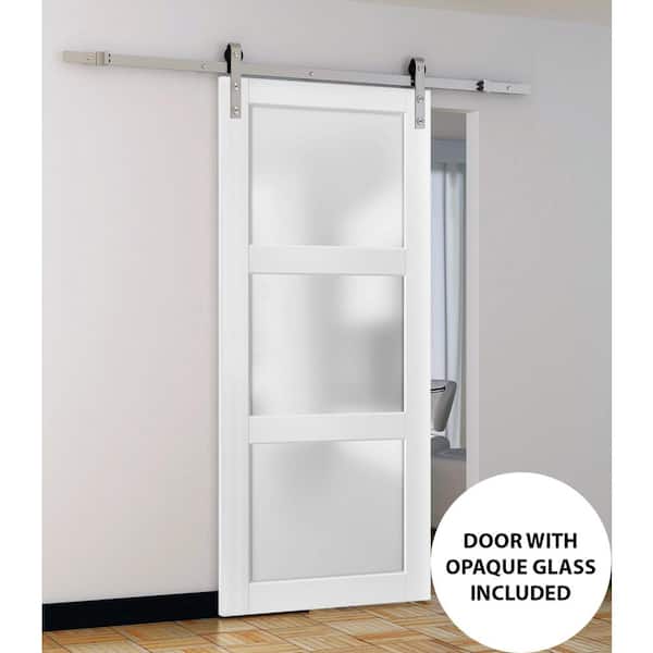 2552 32 in. x 84 in. 3 lite Frosted Glass White Finished Pine Wood Sliding Barn Door with Hardware Kit