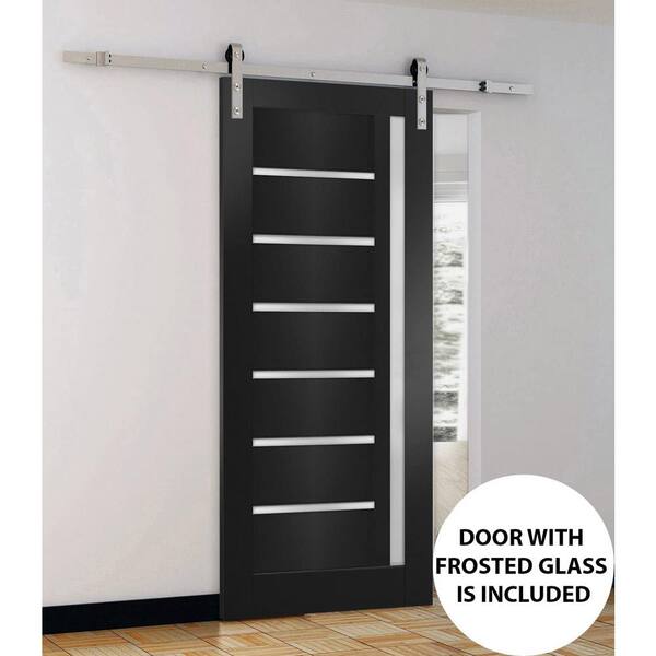 28 in. x 80 in. 1 Panel Frosted Glass Black Matte Solid MDF Sliding Barn Door with Hardware Kit