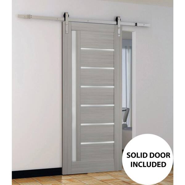28 in. x 80 in. 1 Panel Frosted Glass Light Grey Oak Solid MDF Sliding Barn Door with Hardware Kit