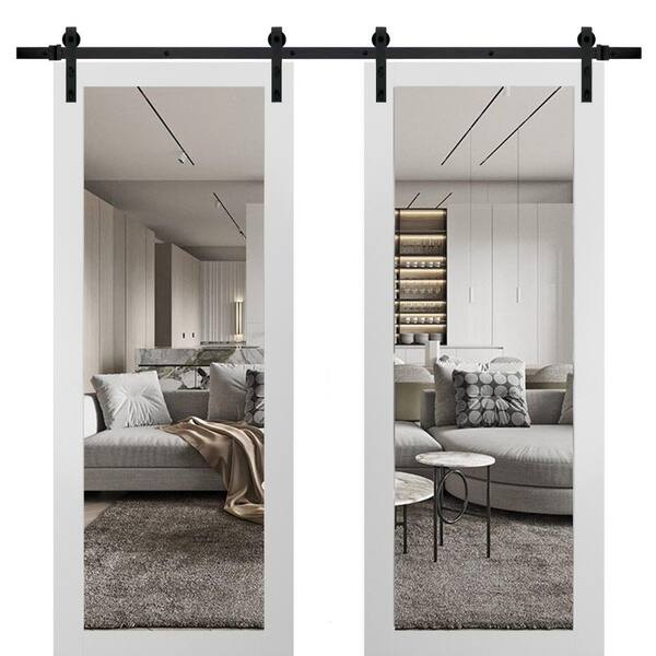 28 in. x 80 in. 2 Panel Clear Glass White Solid Wood Sliding Barn Door with Hardware Kit