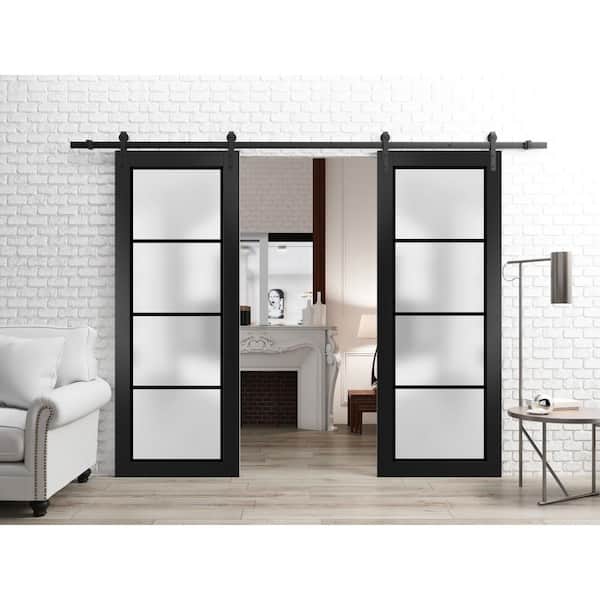 28 in. x 80 in. 2 Panel Frosted Glass Black Matte Solid Wood Sliding Barn Door with Hardware Kit