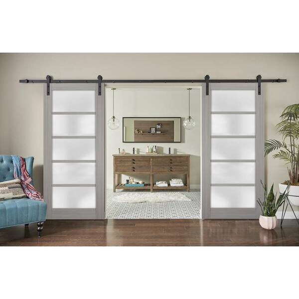 28 in. x 80 in. 2 Panel Frosted Glass Gray Ash Solid MDF Sliding Barn Door with Hardware Kit