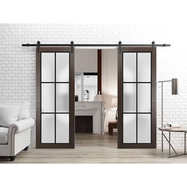 28 in. x 96 in. 2 Panel Frosted Glass Chocolate Ash Solid Wood Sliding Barn Door with Hardware Kit