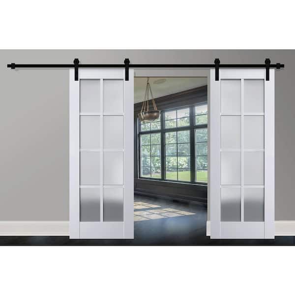 28 in. x 96 in. 2 Panel Frosted Glass White Solid Wood Sliding Barn Door with Hardware Kit