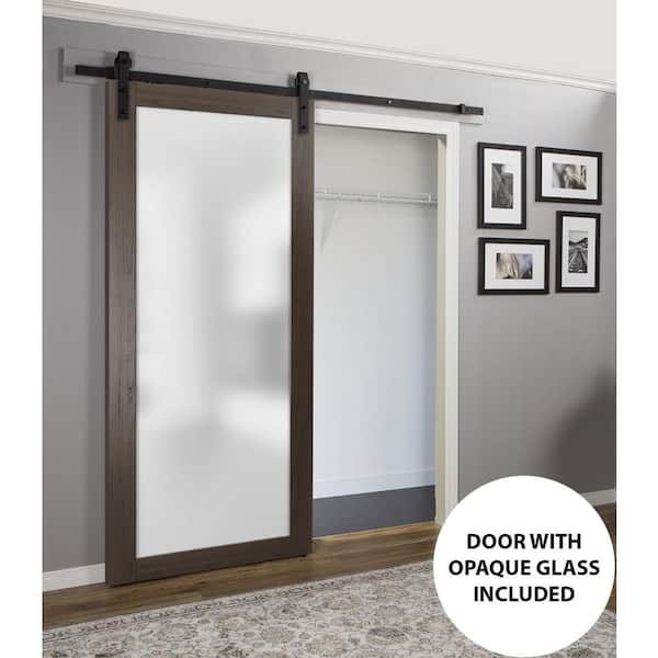 30 in. x 84 in. 1 Panel Frosted Glass Chocolate Ash Solid Wood Sliding Barn Door with Hardware Kit