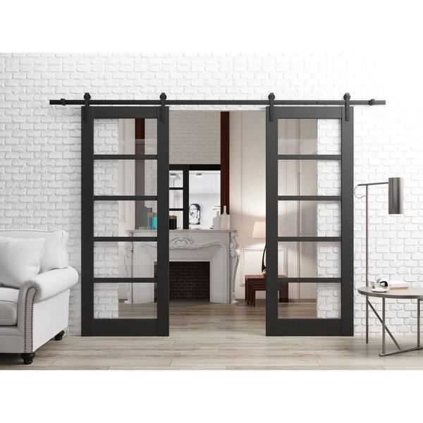 30 in. x 84 in. 2 Panel Clear Glass Black Matte Solid MDF Sliding Barn Door with Hardware Kit