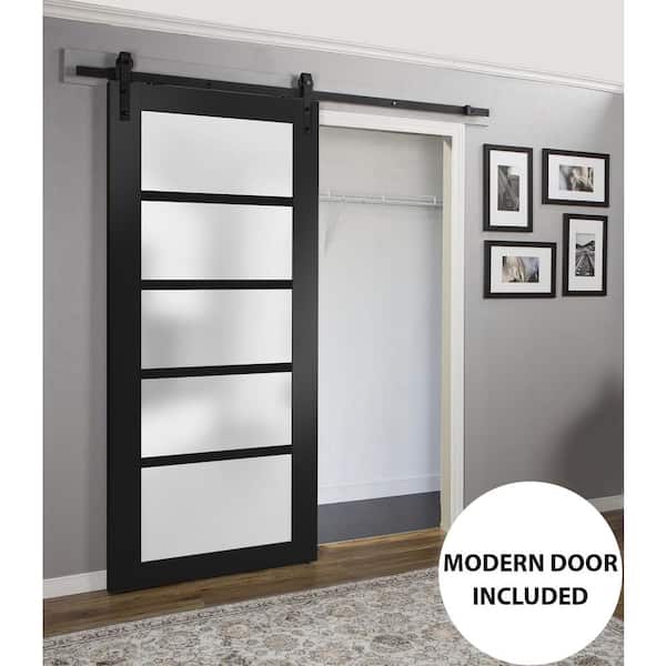 30 in. x 84 in. 5-Panel Black Finished Solid MDF Sliding Door with Black Barn Hardware