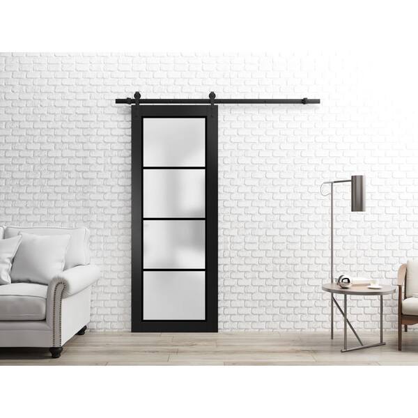 30 in. x 96 in. 1 Panel Frosted Glass Black Matte Solid Wood Sliding Barn Door with Hardware Kit