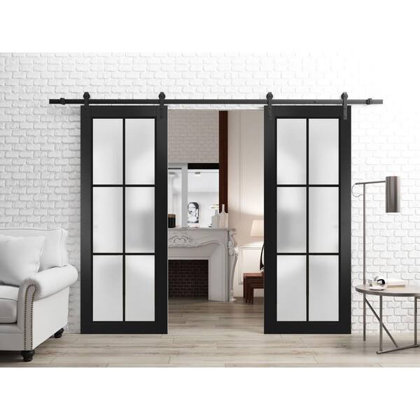 30 in. x 96 in. 2 Panel Frosted Glass Black Matte Solid Wood Sliding Barn Door with Hardware Kit