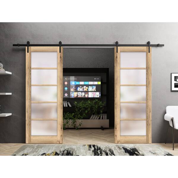 30 in. x 96 in. 2 Panel Frosted Glass Oak Solid Wood Sliding Barn Door with Hardware Kit