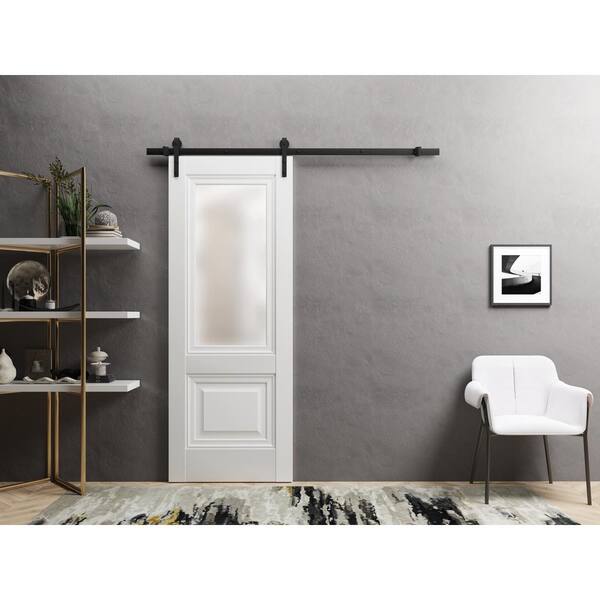 32 in. x 80 in. 1 Panel Frosted Glass White Solid Wood Sliding Barn Door with Hardware Kit