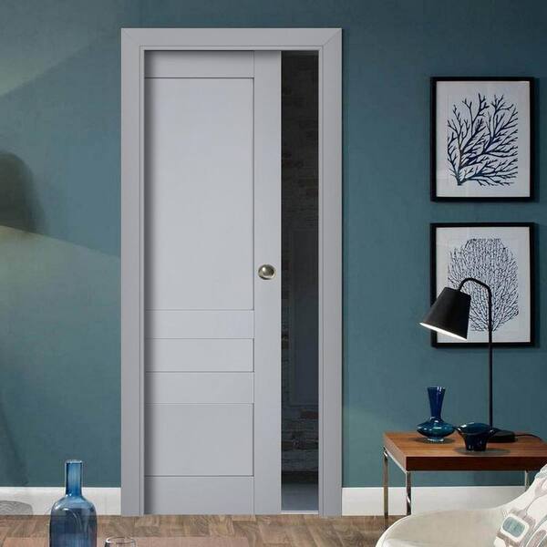 32 in. x 80 in. 1 Panel Matte Grey Finished Solid Wood Sliding Door with Hardware