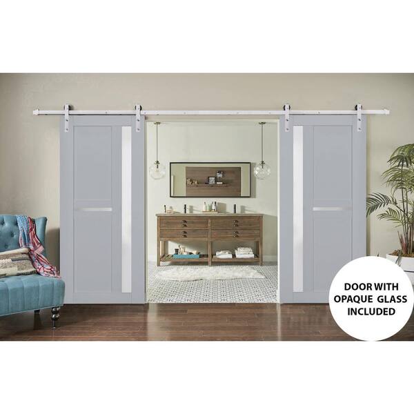 32 in. x 80 in. 2 Panel Frosted Glass Matte Grey Solid Wood Sliding Barn Door with Hardware Kit