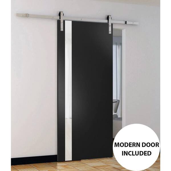 32 in. x 84 in. 1 Panel Frosted Glass Black Matte Solid Wood Sliding Barn Door with Hardware Kit