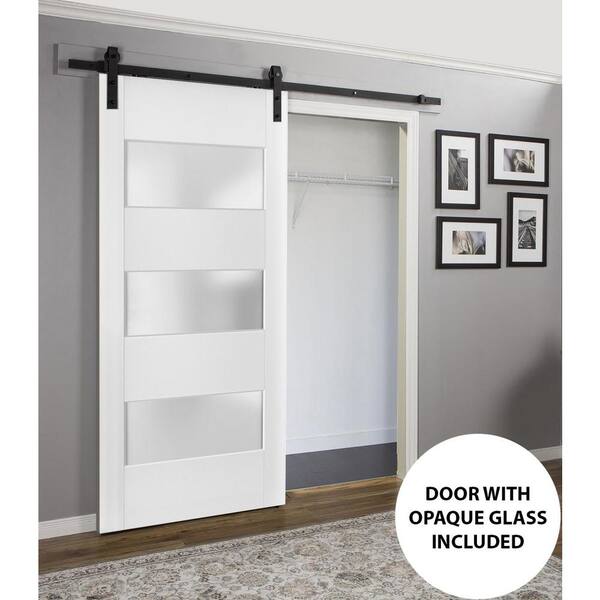 32 in. x 84 in. 1 Panel Frosted Glass White Solid Wood Sliding Barn Door with Hardware Kit