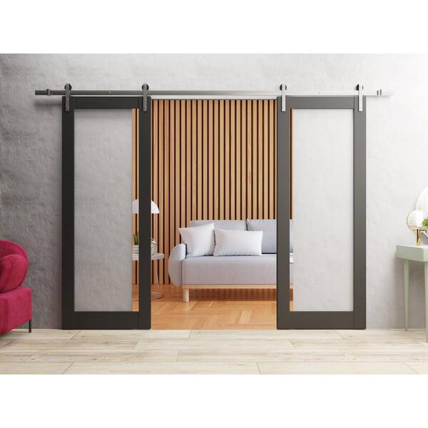 32 in. x 84 in. 2 Panel Clear Glass Black Matte Solid Wood Sliding Barn Door with Hardware Kit