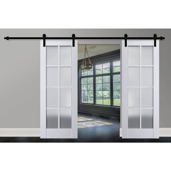 32 in. x 84 in. 2 Panel Frosted Glass White Solid Wood Sliding Barn Door with Hardware Kit