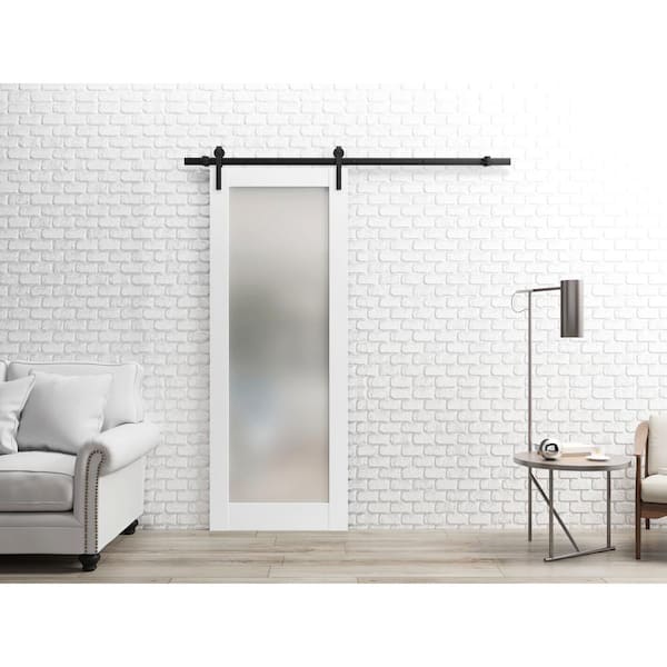 36 in. x 80 in. 1 Panel Frosted Glass White Solid Wood Sliding Barn Door with Hardware Kit