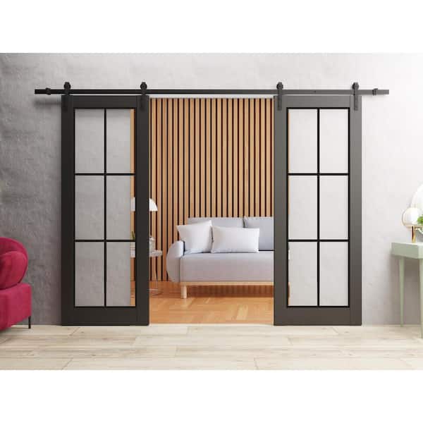 36 in. x 80 in. 2 Panel Clear Glass Black Matte Solid Wood Sliding Barn Door with Hardware Kit