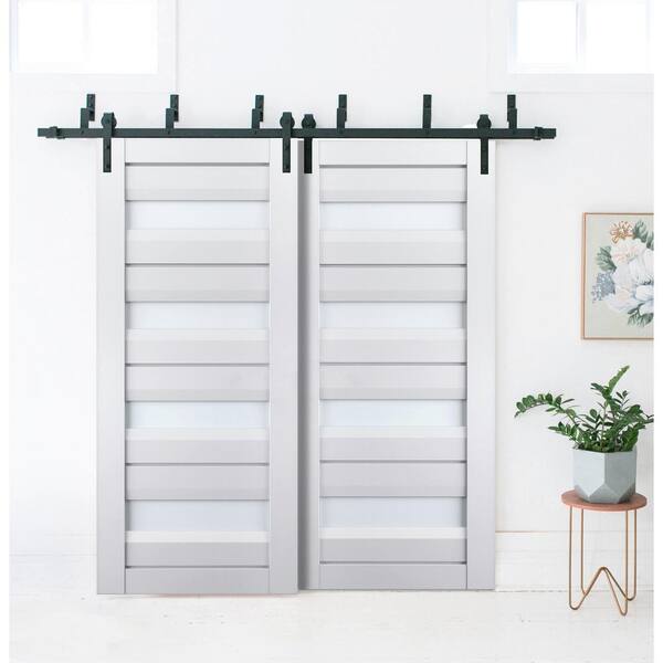 36 in. x 84 in. 2 Panel Frosted Glass White Solid Wood Sliding Barn Door with Hardware Kit
