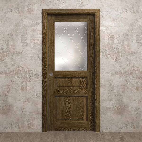 36 in. x 84 in. Frosted Glass Marble Oak Solid Wood Pocket Door With Hardware
